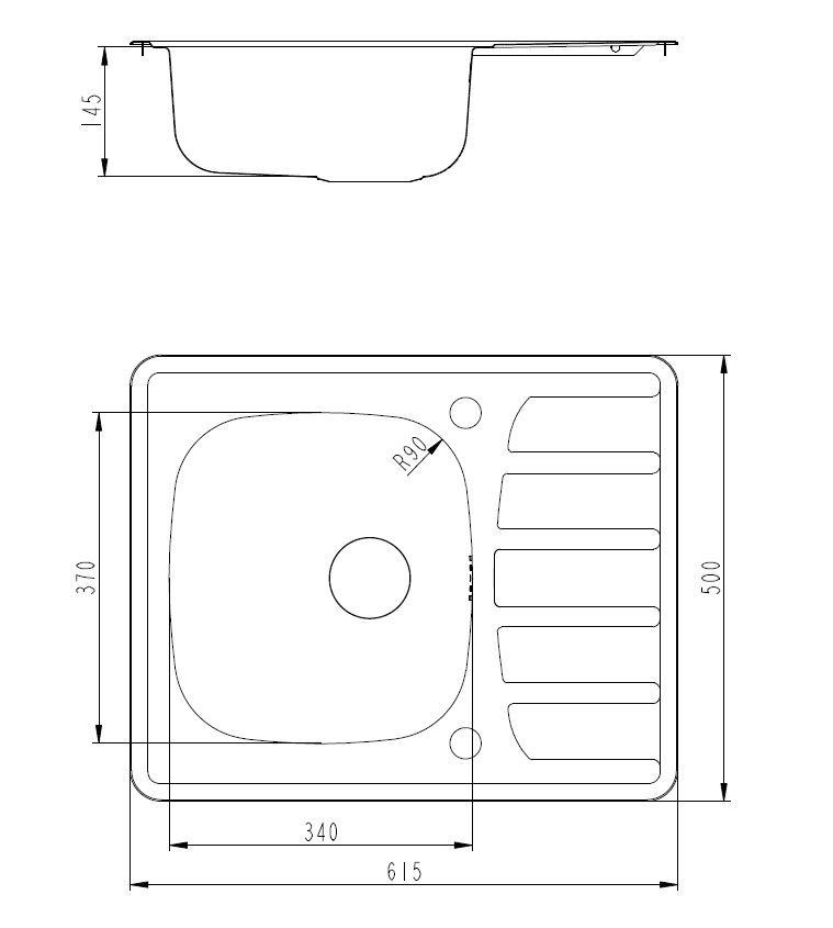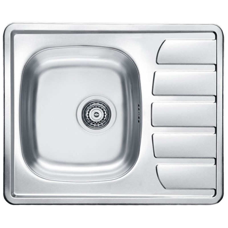 Nerezový dřez s odkapem, plech 0,6 mm, provedení Natur, otočný, rozměr 615 x 500 mm, vana 340 x 370 x 155 mm, horní montáž, minimálně 45 cm skříňka.