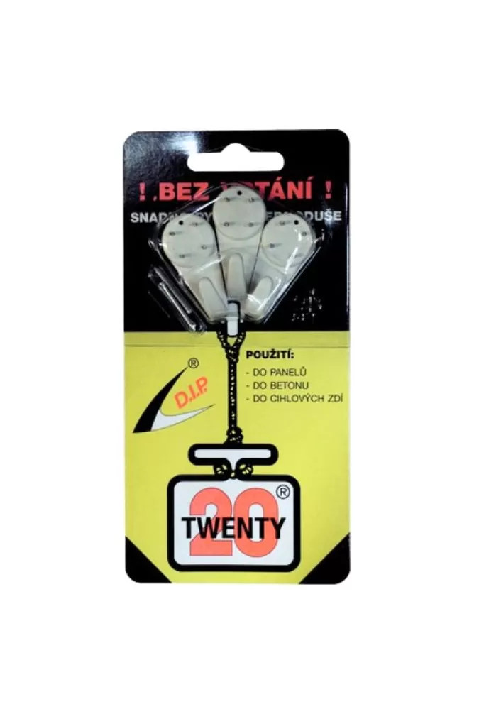 Háčky TWENTY UNIVERSAL jsou vyrobeny z vysoce kvalitní plastické hmoty Polyamid ( Nylon ), která vyniká maximální pevností a odolností. Rovněž použité hroty, ze speciální kalené oceli, jsou povrchově antikorozně upraveny a umožňují aplikaci háčků i v krajně nepříznivých podmínkách. Originální tvar háčků, jehož návrh z roku 1991 je chráněn průmyslovým vzorem 23631, umožňuje všestranné uplatnění.
