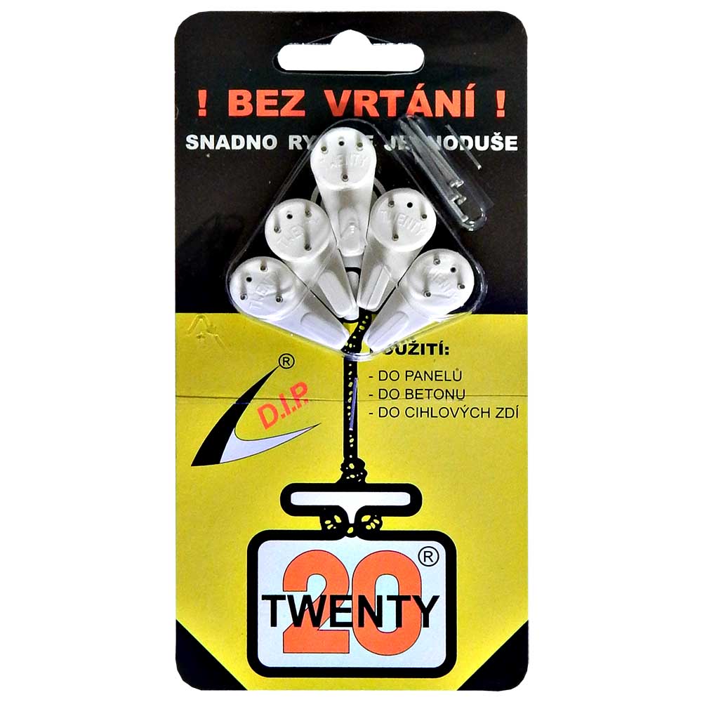 Háčky TWENTY UNIVERSAL jsou vyrobeny z vysoce kvalitní plastické hmoty Polyamid ( Nylon ), která vyniká maximální pevností a odolností. Rovněž použité hroty, ze speciální kalené oceli, jsou povrchově antikorozně upraveny a umožňují aplikaci háčků i v krajně nepříznivých podmínkách. Originální tvar háčků, jehož návrh z roku 1991 je chráněn průmyslovým vzorem 23631, umožňuje všestranné uplatnění.