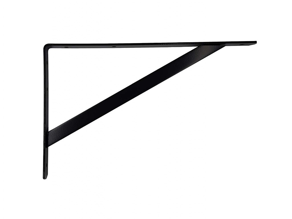 Kovová policová podpěra/konzole k ukotvení policové desky na stěnu. Nosnost podpěry je zesílená výztuhou. Konzoli je třeba dobře ukotvit do stěny pomocí šroubů se zapuštěnou hlavou (nejsou součásí).