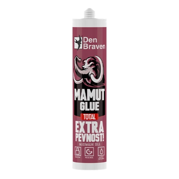 Den Braven MAMUT GLUE Total je vysoce kvalitní, profesionální a univerzální lepidlo na bázi MS polymerů, které vykazuje extrémně vysokou pevnost v tahu a vysokou konečnou přídržnosti. Vytvrzuje vulkanizací vzdušné vlhkosti, vytváří vysokopevnostní elastický spoj. Jedná se o univerzální lepidlo pro lepení mnoha stavebních materiálů a je určeno k lepení konstrukčních vodotěsných spojů ve stavebním a strojním průmyslu. Lepidlo Mamut Glue Total je univerzální lepidlo a tmel pro všechny připojovací spáry, trhliny a nerovnosti ve stavebnictví a průmyslu na údržbu, renovaci, opravy, výstavbu, instalace a montáž. Stejně tak je vhodné k použití při lepení konstrukčních dílů automobilů, přívěsů, autobusů, karavanů, osobních vagónů, lodí, fasád, nábytku apod. Lepidlo disponuje objemem 290 ml.